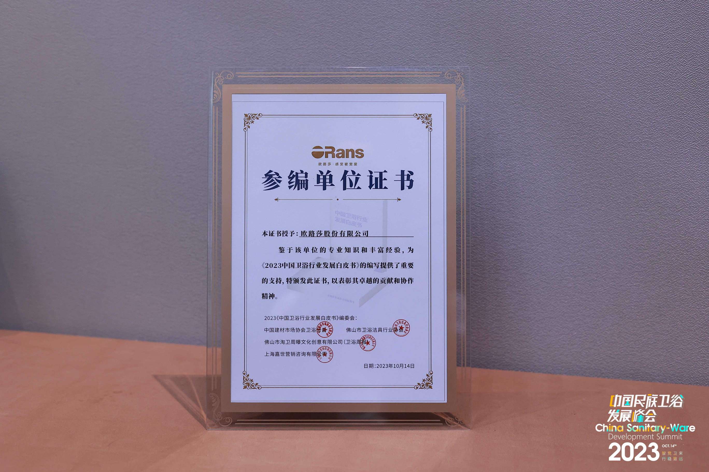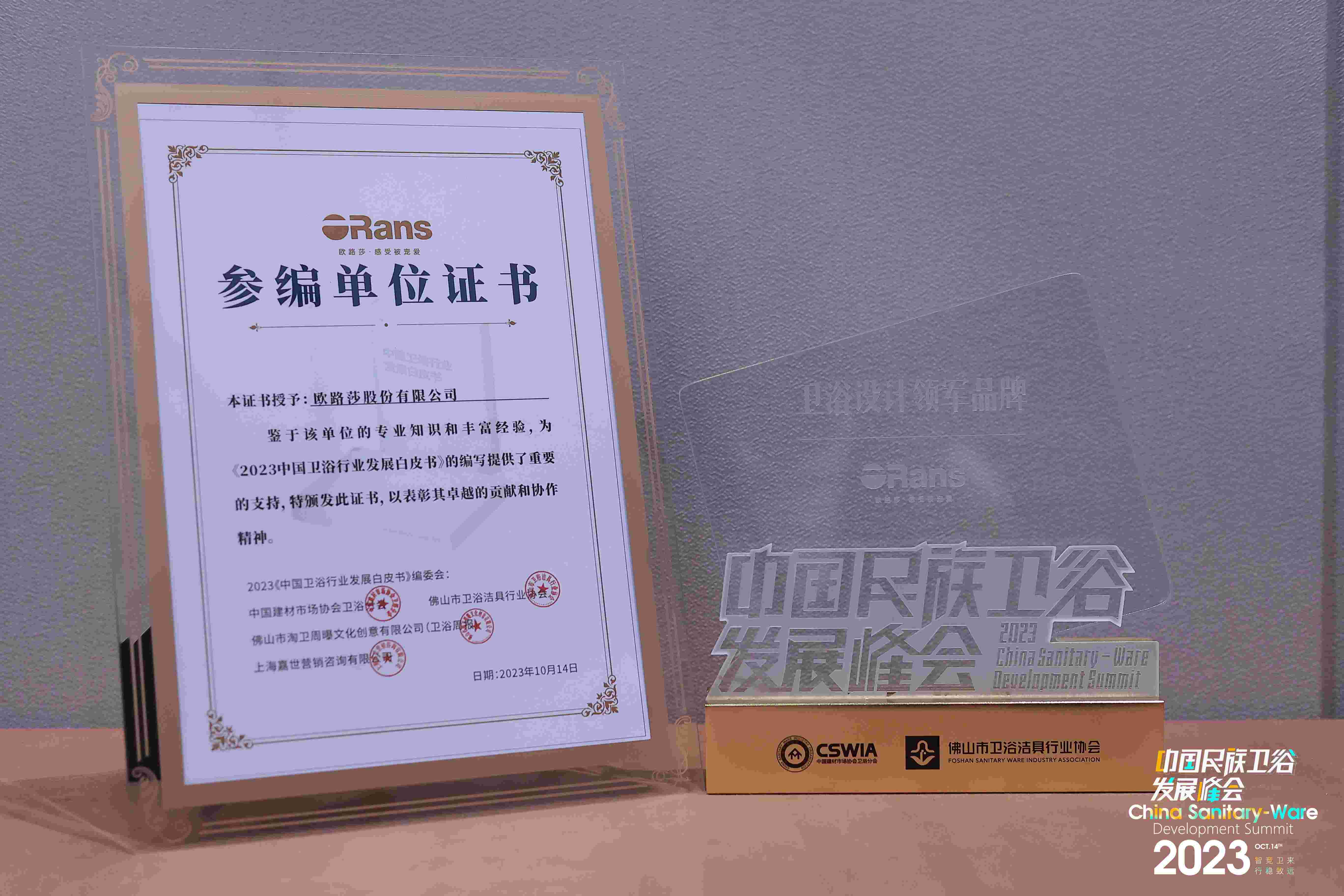 歐路莎衛(wèi)浴再次榮登“中國衛(wèi)浴品牌榮光榜”,奪得“衛(wèi)浴設(shè)計(jì)領(lǐng)軍品牌”,并為編寫《2023 中國衛(wèi)浴行業(yè)發(fā)展白皮書》提供重要支持,獲頒“參編單位證書”。