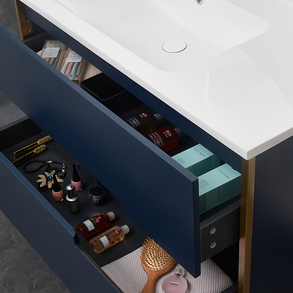 實木多層板,層層精工,防水防潮;304不銹鋼柜腳,防腐防銹;微晶石一體臺盆,易潔美觀;靜音液壓滑道,輕松緩沖,超承重;品質鉸鏈,開合無憂。
